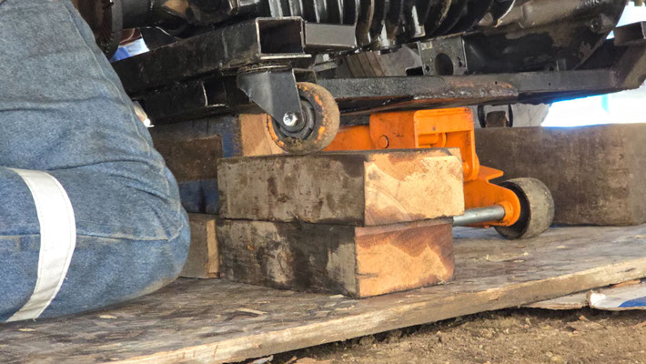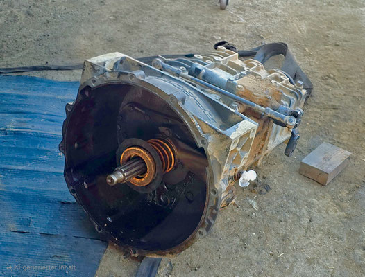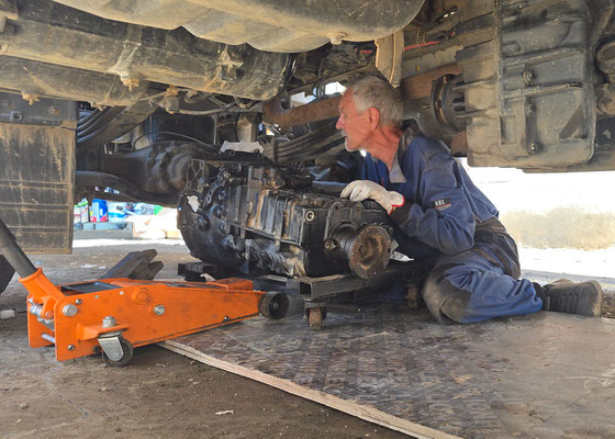 Vor der Montage habe ich etwas Bammel. Das Getriebe ist sicher um die 100 kg oder mehr und muss von unten eingebaut werden. Da wir hier weder über einen Lift verfügen, um den LKW zu heben, noch über geeignetes Material, um das Getriebe sicher vom Boden hochzuheben, wird dies eine sehr heikle Angelegenheit. Mit einem Autowagenheber heben wir das Getriebe an und binden es mit einem Gurt am Chassis fest. Danach Wagenheber runter, Holz unterlegen und Wagenheber wieder hoch, Gurt nachziehen und alles nochmals. Drei Mal brauchen wir, um das Getriebe auf die richtige Höhe zu bekommen.