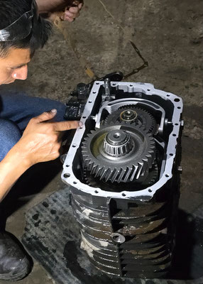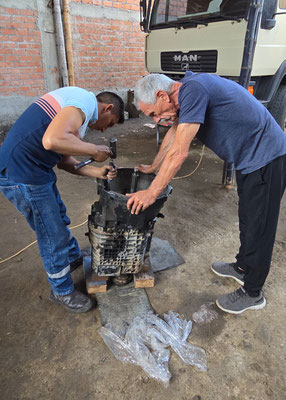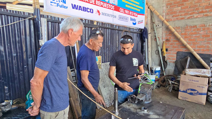 Bladimir nimmt die Hauptwelle auseinander, erstes Problem: Das Lager hat keine Nummer. Zwar hat MAN eine Ersatzteilnummer, aber diese ist nur für MAN gedacht. Ohne Originalnummer auf dem Lager wird es schwer, das richtige Lager zu finden. Wir suchen hier im Ort, in Lima, in Ecuador, in Paraguay und natürlich in Europa. Renate, Bladimir, Marco und ich sind wie wild am Suchen – erfolglos, das Lager ist unauffindbar.