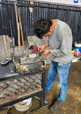 Der Dreher muss also das Lager um 0,5 mm je Seite abdrehen, eine Nut machen und das Getriebegehäuse und das Gegenstück um je 2 mm ausdrehen. Der Mechaniker schaut sich alles an und wie hier üblich: „no problemas“.